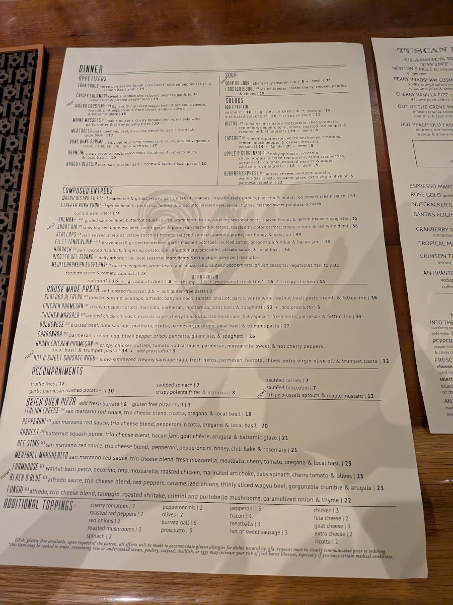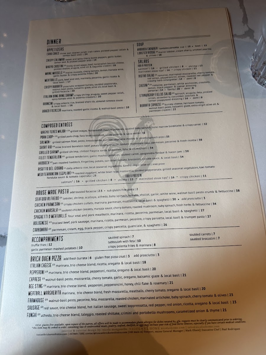 Tuscan Brick Oven Bistro in Freeport, ME, offers a vibrant journey through authentic Tuscan and Italian flavors, all crafted with care and creativity. The menu highlights a sophisticated blend of rustic and refined dishes, from the Wagyu Bistro Filet with garlic mashed potatoes and brandy red pepper cream sauce to the Mediterranean Eggplant featuring roasted vegetables and a rich tomato fonduta. Their brick oven pizzas, while generously topped, capture that classic Italian finesse, balancing rich cheeses and fresh ingredients. The diverse kids’ offerings ensure younger diners enjoy hearty, flavorful meals too.